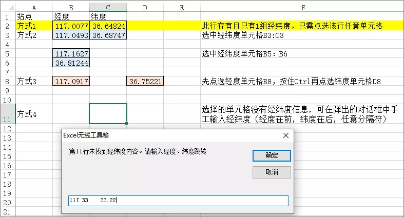 B8,再按住ctrl选中D8 - 方式4、如果选择的单元格没有经纬度信息,可在弹出的对话框中手工输入经纬度(经度在前,纬度在后,任意分隔符)